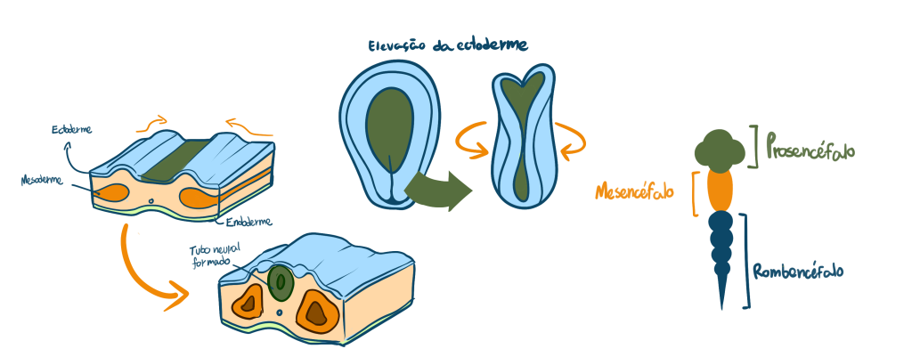 A partir de então, as bordas laterais da ectoderma se elevam, se contraem e se fundem para formar um cilindro oco conhecido como tubo neural. As células progenitoras neurais na parte mais anterior do tubo neural originarão o telencéfalo e diencéfalo, enquanto as células mais posteriores darão origem ao mesencéfalo, rombencéfalo e à medula espinhal.